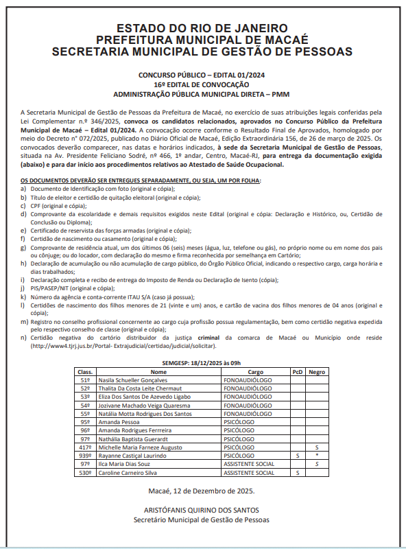 A Prefeitura de Macaé publicou no Diário Oficial do Município neste sábado, 13 de dezembro de 2025, o 16º Edital de Convocação referente ao Concurso Público 01/2024. Nesta etapa estão sendo chamados assistentes sociais, psicólogos e fonoaudiólogos.