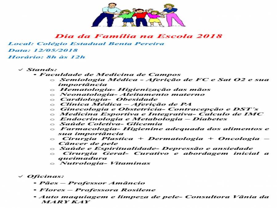 Promover a integração e a prestação de serviços de utilidade pública a toda comunidade escolar. É com esse objetivo que o Colégio Escola Benta Pereira, no Jardim Carioca, em Guarus, Campos, realiza neste sábado (12/05), o “Dia da Família na Escola”. O projeto ressalta a importância da participação da família no processo ensino-aprendizagem, através de atividades que atendam aos interesses de toda a Comunidade.