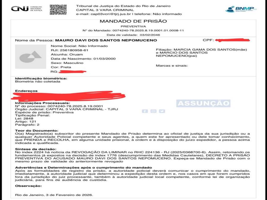 O Superior Tribunal de Justiça revogou o habeas corpus que havia colocado o cantor Mauro Davi dos Santos Nepomuceno, conhecido como Oruam, em liberdade mediante o cumprimento de medidas cautelares. A decisão foi tomada pelo ministro Joel Ilan Paciornik e comunicada ao Tribunal de Justiça do Rio de Janeiro, que agora avalia a expedição do mandado de prisão preventiva.