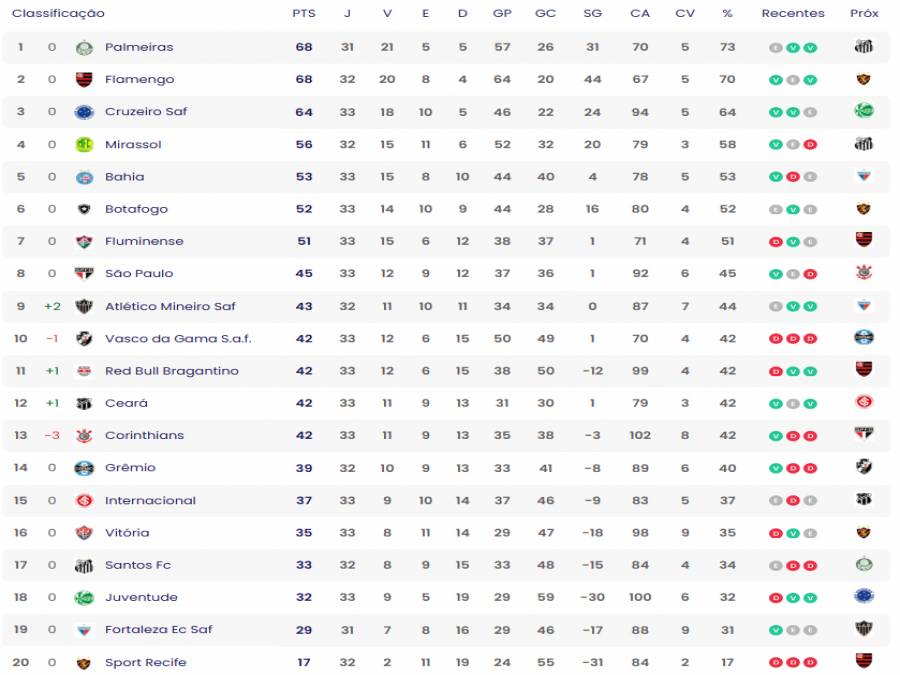 Enquanto isso, o Flamengo venceu o Santos por 3 a 2 no Maracanã, em um jogo quente que contou com reclamações intensas da equipe paulista contra a arbitragem. Com o resultado, o time carioca chega aos mesmos 68 pontos do Palmeiras e mantém vivo o sonho do título.